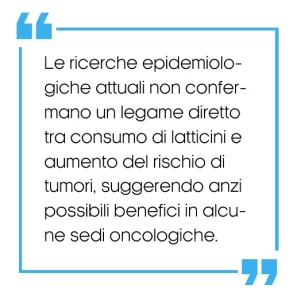 Per quanto riguarda il rischio oncologico, le analisi epidemiologiche raccolte ed analizzate dalla scoping review condotta dal team del prof. Hauner [10] evidenziano come non vi siano associazioni dirette o inverse tra il consumo di latticini interi ed effetti negativi sulla salute.