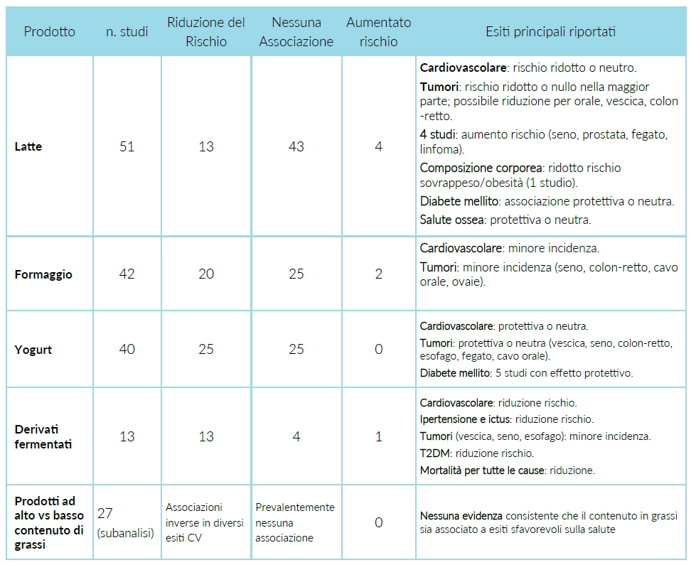 Esiti per la salute ed associazione del consumo di derivati lattiero-caseari con evidenza dell’associazione con riduzione o aumentato rischio. La maggior parte delle evidenze disponibili indica associazioni neutre o favorevoli tra consumo di latticini ed esiti di salute, con limitate evidenze di rischio aumentato [10]